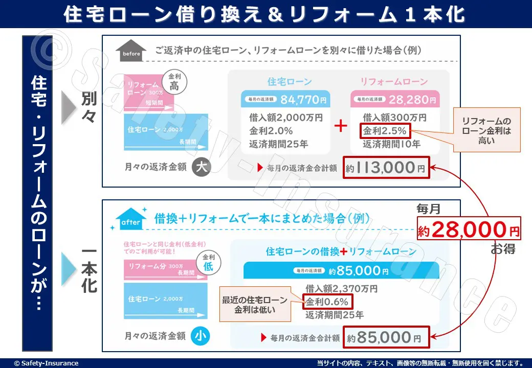 簡単に説明すると、金利の安い住宅ローンに借り換えるタイミングで、リフォーム分を含めて借り換え(借り入れ)を行い、住宅ローン1本にまとめる方法です。