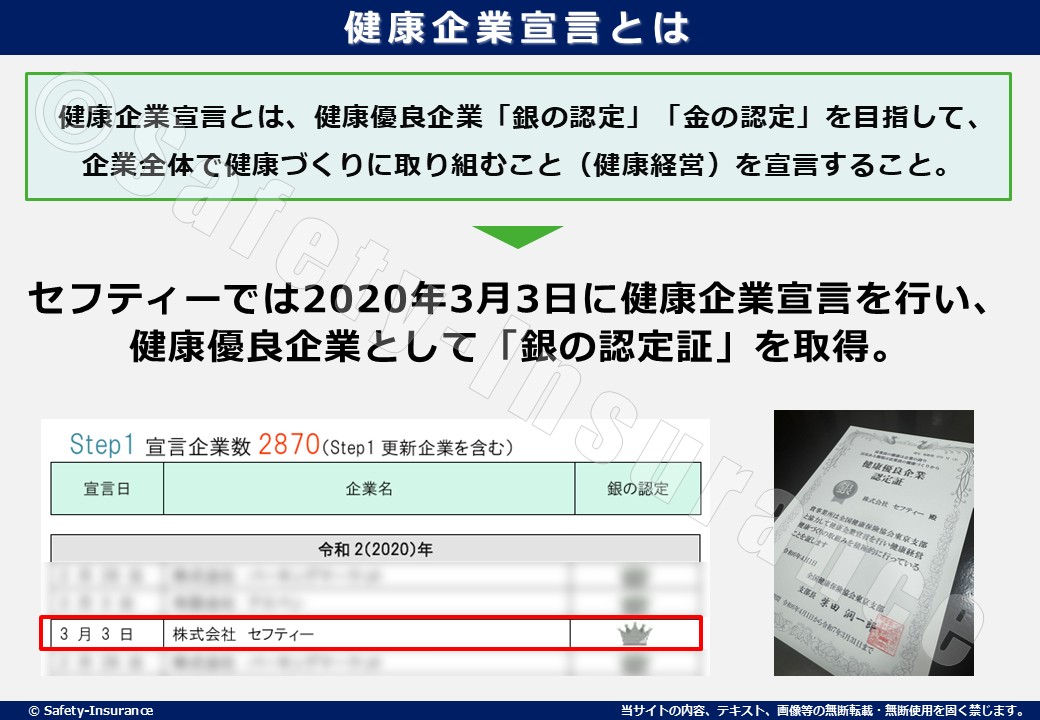 一定の成果を上げた企業は「健康優良企業」として認定されます。セフティーは、加入している健康保険である協会けんぽ(全国健康保険協会)を通じてこの宣言を行いました。