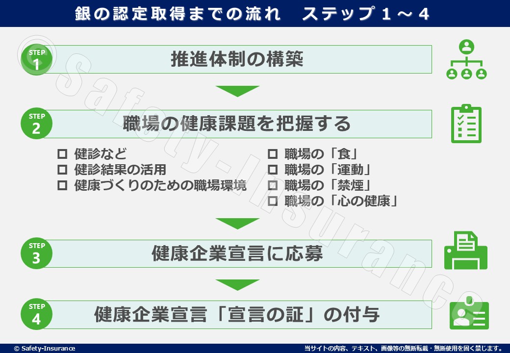 銀の認定(STEP1)では、健康経営を行うために職場の健康づくりに取組む環境を整えることを目指します。