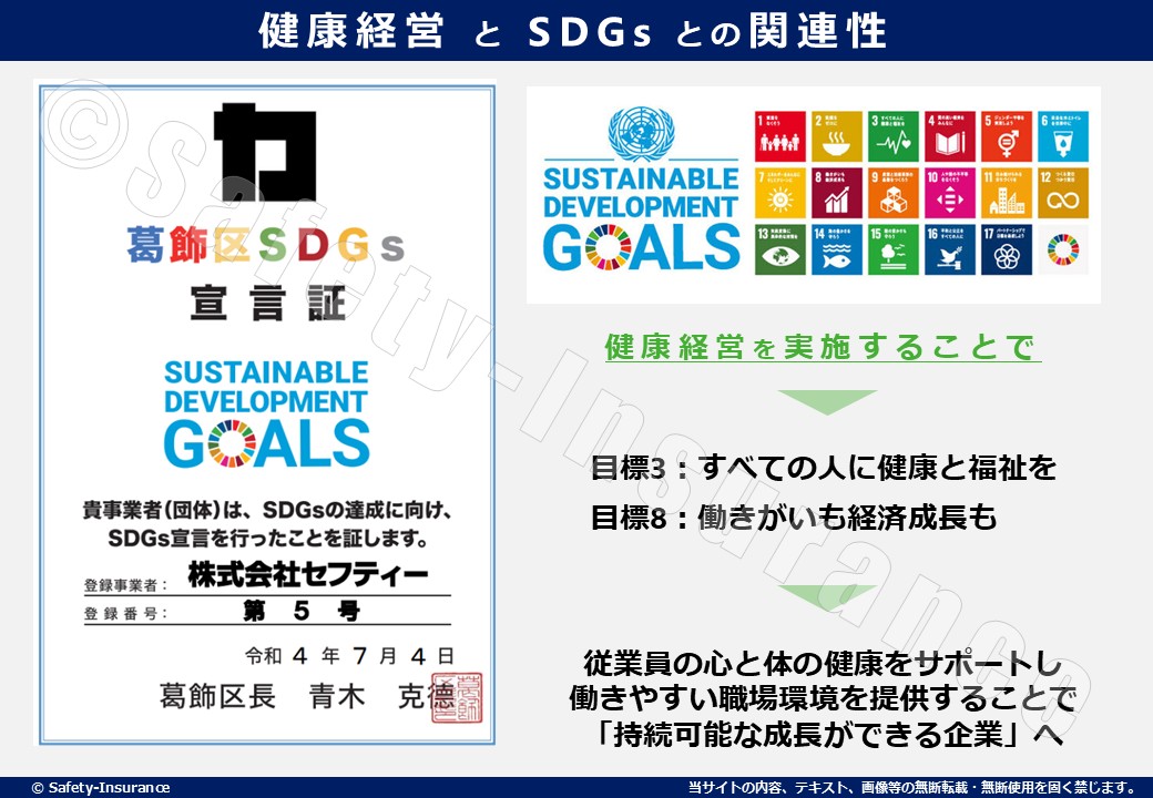 その環境を整えることが、結果として全てのステークホルダーにとってプラスになると信じています。また、この健康経営の取り組みは、SDGs(持続可能な開発目標)の「目標3:すべての人に健康と福祉を」と「目標8:働きがいも経済成長も」に深く関わっています。