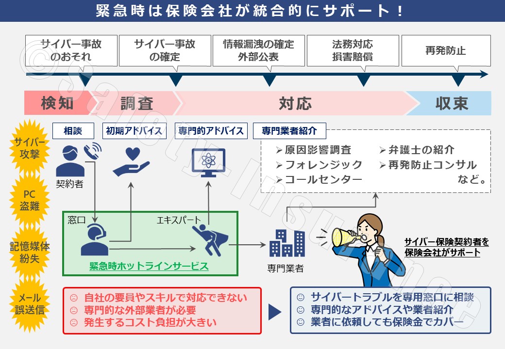 そこでお役立ち出来るのがサイバー保険です。サイバー保険には事故が発生した際に対応を保険会社がサポートするサービスが付帯されている商品もあります。