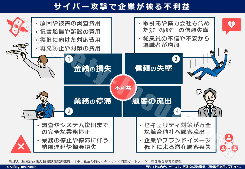 特に「金銭の損失」はサイバー事故の内容によっては数百万あるいは数千万円の損害が発生する可能性があり、経営にとって大きなダメージとなります。また、他の不利益も同時に発生するため、会社の存続が危ぶまれる事態になりかねません。