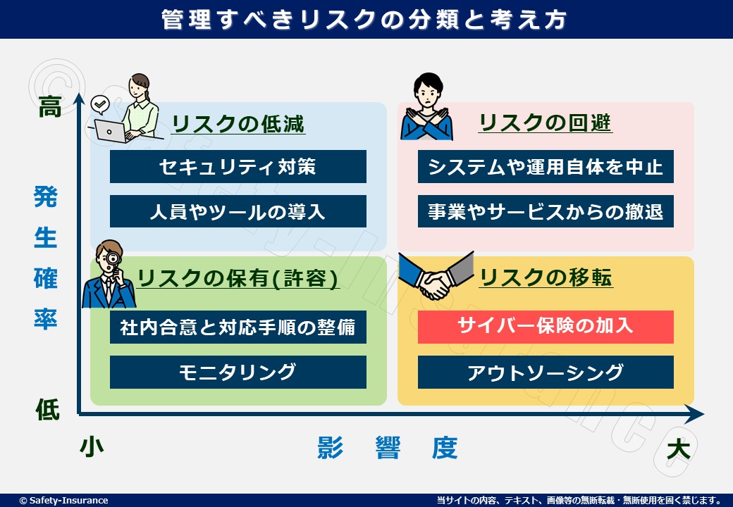 では、「サイバー攻撃による業務停止」や「盗難されたパソコンから個人情報が流出」はどうでしょうか。これらのリスクについてセキュリティツールの導入など各種対策を行うのは当然ですが、【発生確率:低】のにも関わらず【影響度:大】のためリスクの移転『サイバー保険』が有効です。
