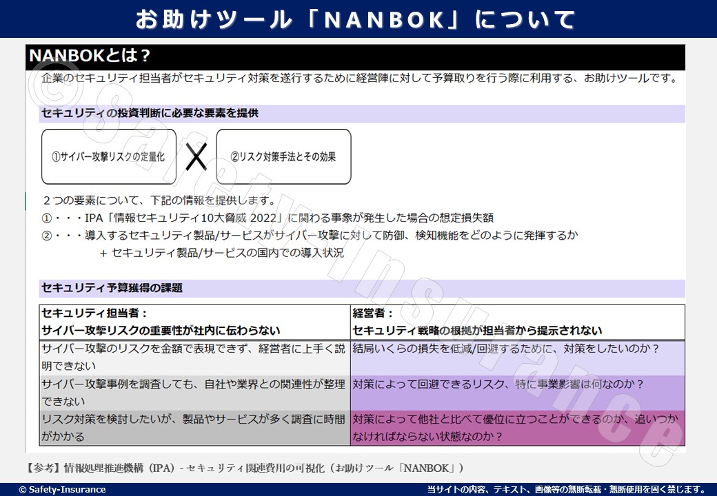 情報処理推進機構(IPA)- セキュリティ関連費用の可視化(お助けツール「NANBOK」)