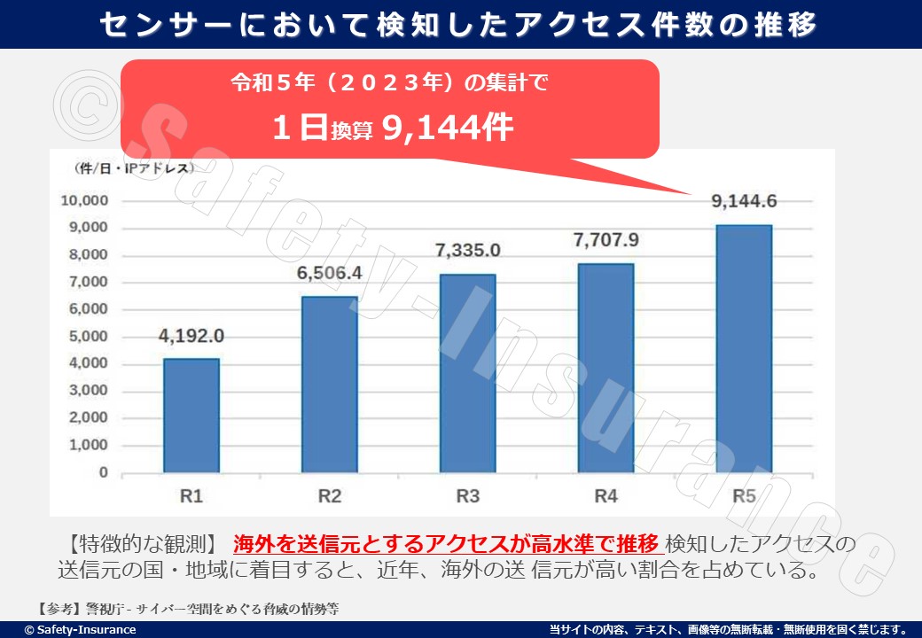 中小企業も人ごとではありません。警視庁では、通常のインターネット利用では考えられない通信(サイバー空間で脆弱性の探索行為などを無差別に行った悪意がある可能性が高い通信)の検知数を集計しております。