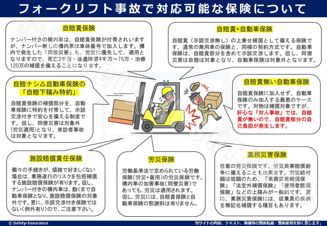 - フォークリフト所有使用者、同僚者、被災者を含めた関係者全ては、構内の甘えを捨て、事故の初期対応や、社外操縦者が起こした事故にも耐え得る保険を備えておく。