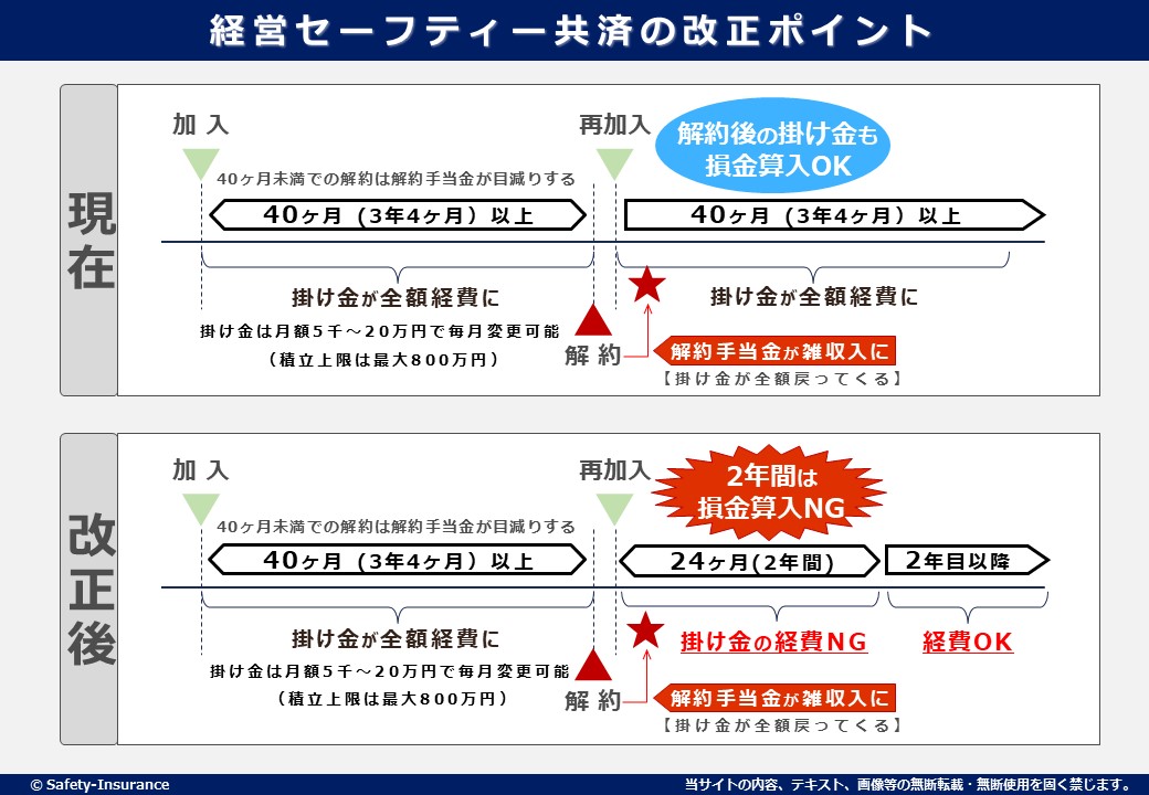 上述したとおり、経営セーフティー共済は一定の節税(課税の繰延)効果があります。しかし、節税効果を目的とした『40ヶ月(3年4ヶ月)で解約してすぐ再加入を行う』企業が増えてしまい、本来の制度利用に基づく行動ではないと判断されてしまいました。