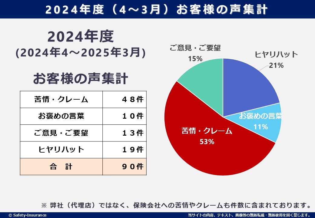 - ※苦情・クレームは弊社(代理店)だけではなく、保険会社への苦情やクレームも件数に含まれております。