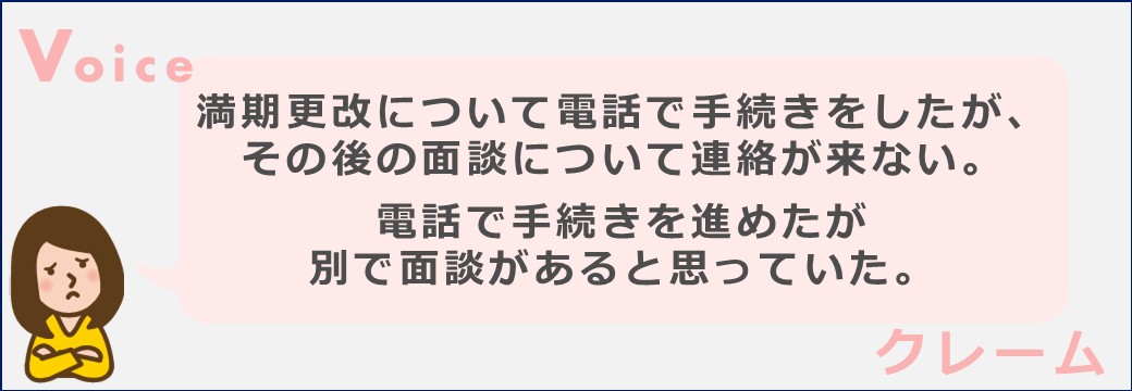 今回は担当者がお客様との認識齟齬(担当者の思い込み)で「非対面」にて更改を進めてしまい、意向把握も電話で実施したことから、面談が不要と勝手に判断をしてしまいました。