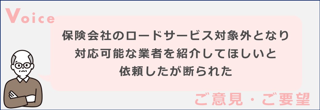保険会社のロードサービス窓口では、サービス対象外案件への柔軟な対応(業者紹介など)を行うことが難しいのが現状です。