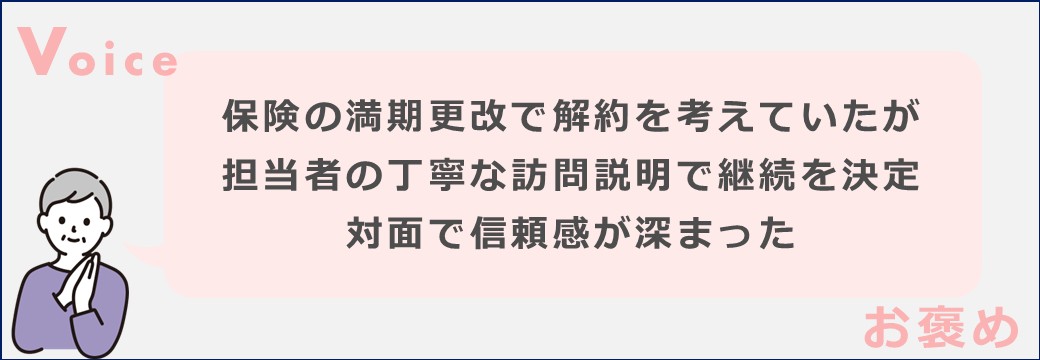 保険の満期更改にあたって解約を考えていましたが、担当の方が自宅まで訪問してくださり、