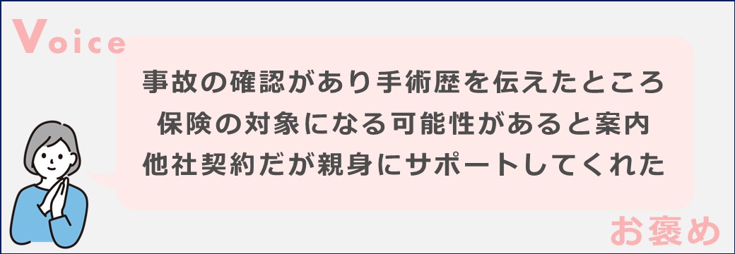 それにも関わらず、保険金の請求について親身にサポートしてくれ、本当に助かりました。