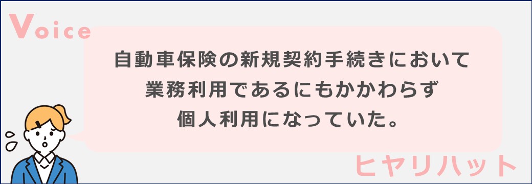 自動車保険の新規契約手続きにおいて、業務利用であるにもかかわらず、個人利用になっていた。