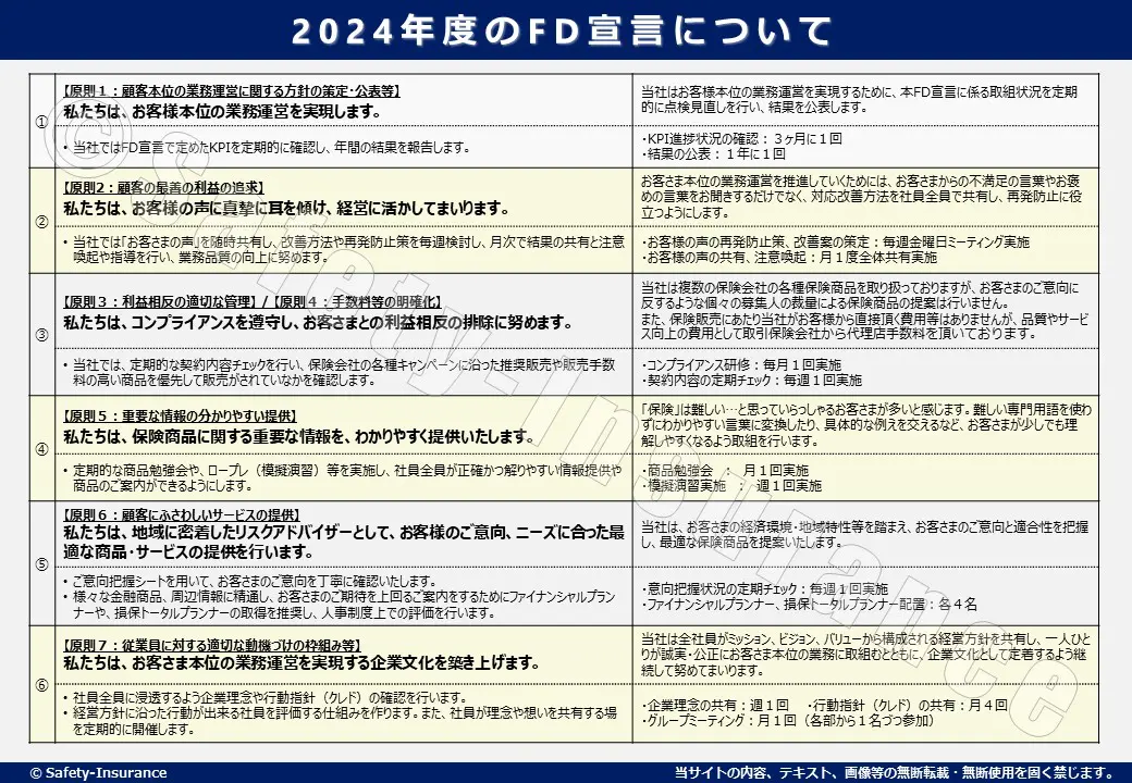 【原則1】顧客本位の業務運営に関する方針の策定・公表等【方針1】当社はお客様本位の業務運営を実現するために、本FD宣言に係る取組状況を定期的に点検見直しを行い、結果を公表します。