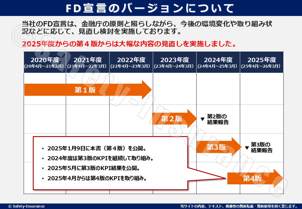 当社のFD宣言は、金融庁の原則と照らしながら、今後の環境変化や取り組み状況などに応じて、見直し検討を実施しております。