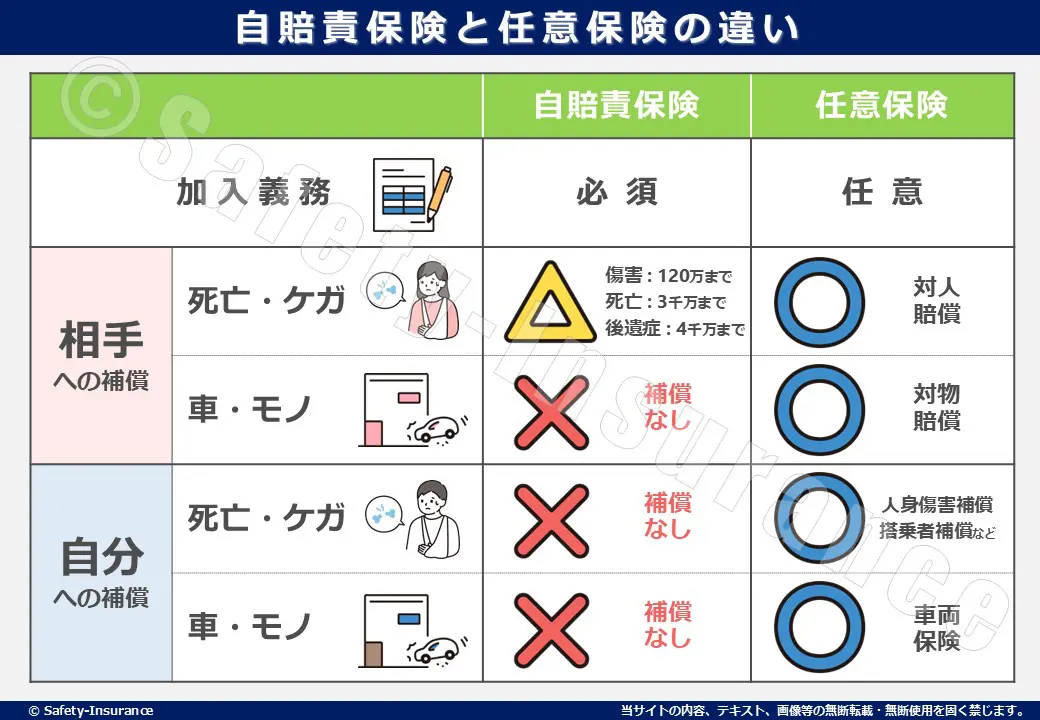 万が一に備えて任意保険に加入しておくのが安心です。以下は自賠責保険と任意保険の違いです。
