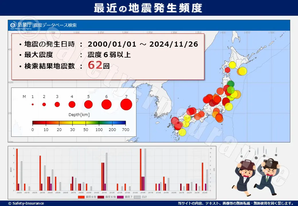 日本は特に地震による被害が多い国です。ちなみに2024年1月~10月末までの震度1以上の地震発生回数は3,262回、2000年~2024年までの震度6以上の地震は62回も発生しています。