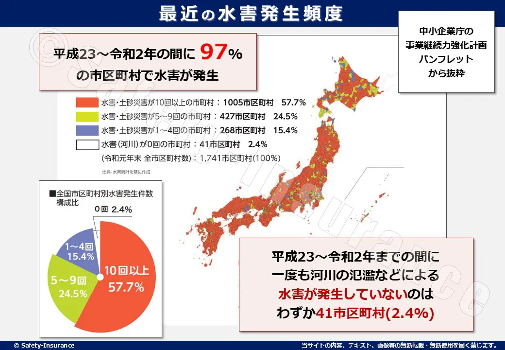 平成23年から令和2年までの水害統計によると、10年間で97.6%の市区町村で1回以上の水害が起きていて、水害が発生していないのは、わずか2.4%(41市区町村)に過ぎません。
