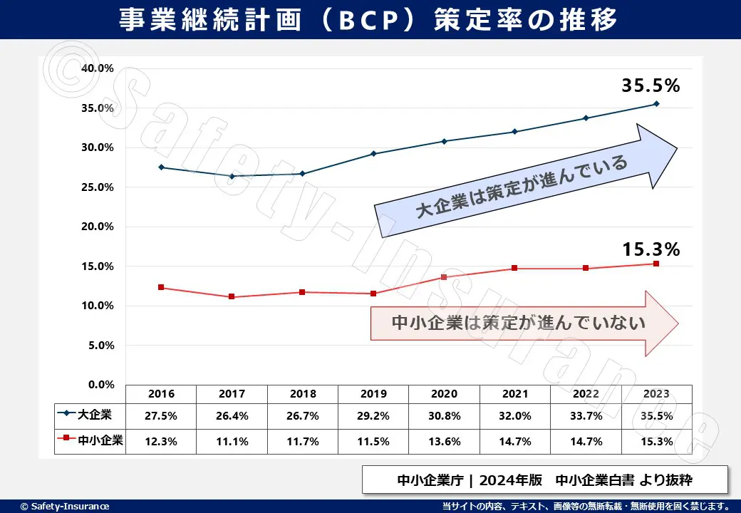 ところが、中小企業における事業継続計画(BCP)の策定率は、2023年5月時点で15.3%程度にとどまっている状況が続いています。(参考:中小企業庁 | 2024年版 中小企業白書 より抜粋)