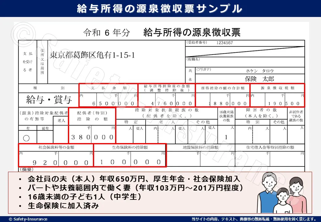 では、具体的に給与所得の源泉徴収票を見ながら解説します。今回は架空のご家族(Aさん)を例にして内容を確認して行きましょう。