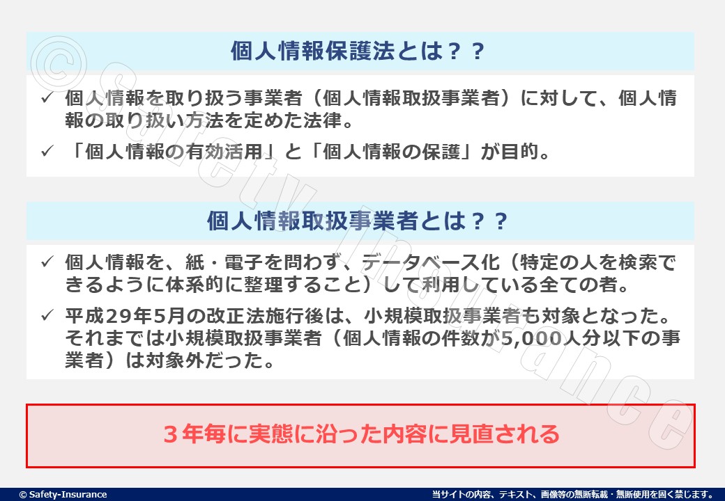 2017年の個人情報保護法の改正までは、取り扱っている個人情報の数が5,000人分以下の事業者は個人情報保護法の対象外となっていましたが、この改正により個人情報を取り扱うすべての事業者が法の対象になりました。