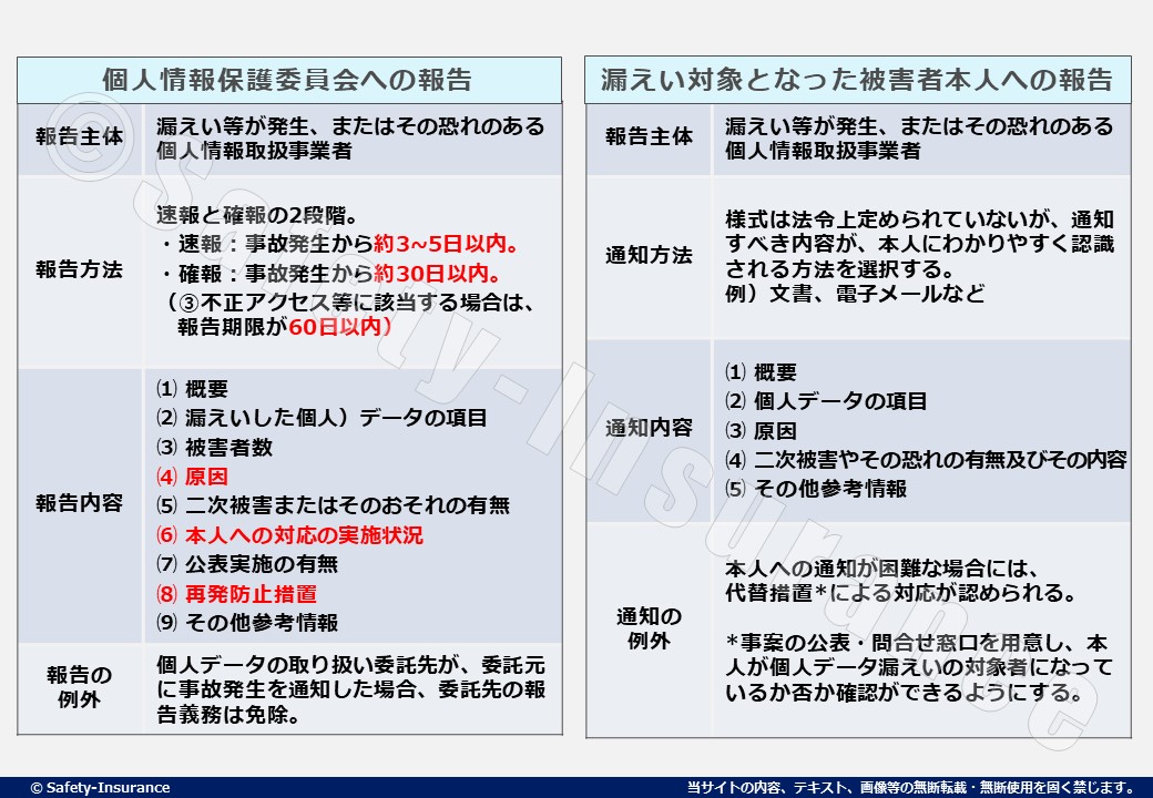 個人情報保護委員会への報告は、速報ベースで3~5日以内、報告内容は原因や再発防止策などが必要となります。