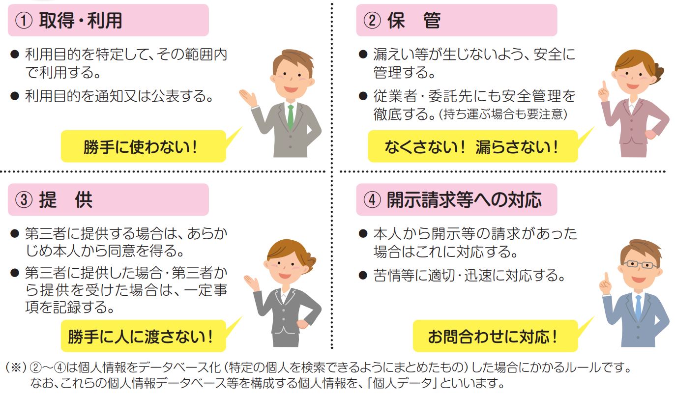 個人情報保護法では、それらの事業者(個人情報取扱事業者)が個人情報を取扱いする上で、守るべき4つの基本ルールを規定しております。