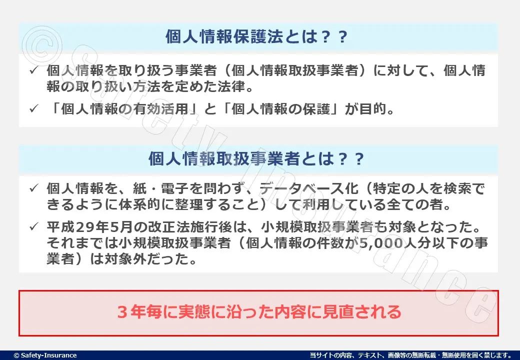 そして国際的な法制定が進んだこともあり、国内では2003年に公布・成立後、2005年に施行されることになりました。日本における個人情報保護法は、国内外の政策・技術・産業の状況を踏まえた上で、3年毎に検討を行い、必要に応じて改正される決まりになっております。