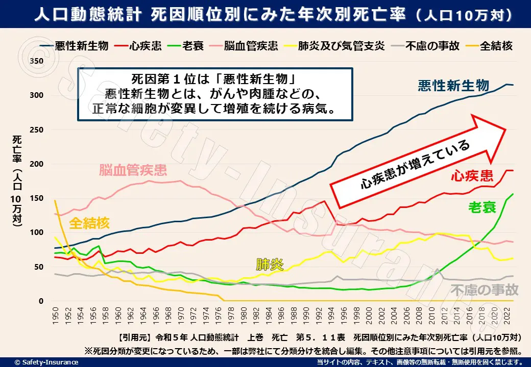 1位は依然として悪性新生物(がんや肉腫など、細胞が異常に増殖する病気)が占めていますが、心疾患の増加傾向は見過ごせません。