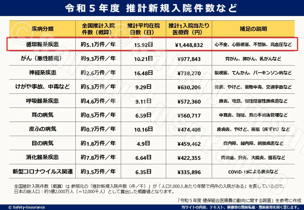 この表を見て分かる通り、循環器系疾患は平均在院日数が15.92日、1入院当たり医療費が約150万円となり、他の病気と比べても在院日数も医療費も高いです。