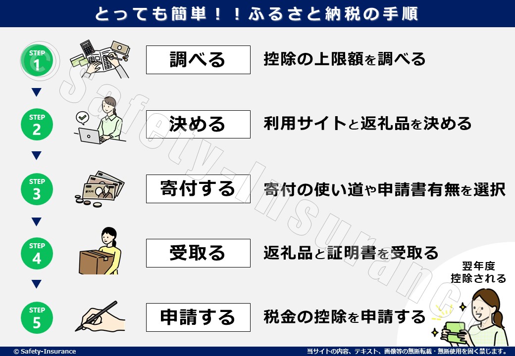 今回は、実際にふるさと納税を始めたい!と思った方へ、実際の手続き手順について分かりやすくお伝えするため「5つのステップ」でご説明します。