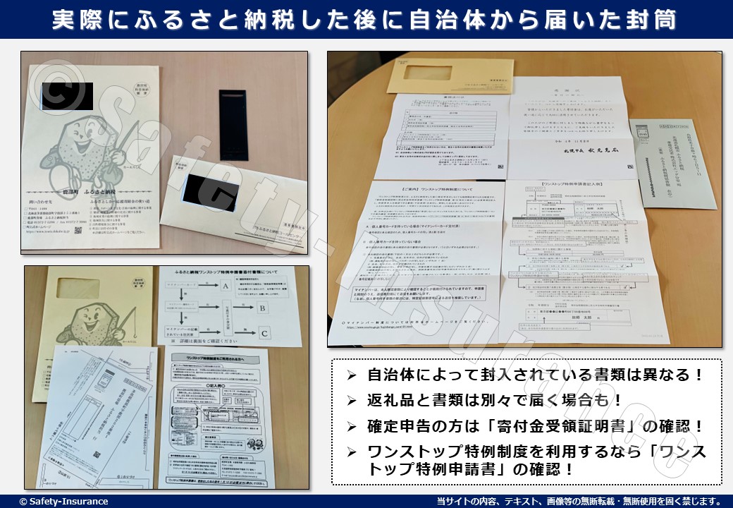 返礼品と書類は別々で届く自治体もあるのでご注意ください。特に書類については来年度の税金を控除するための大切な資料となるので必ず確認をしましょう。