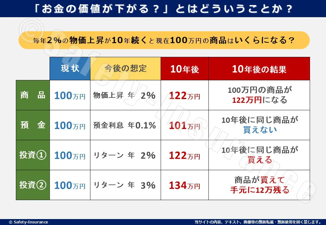 政府は「物価上昇率 [インフレ率] 2%」で安定的に持続する経済と社会を目指しています。 これが上手くと、物の値段が毎年2%ずつ上昇するので、相対的にお金の価値が下がってしまいます。