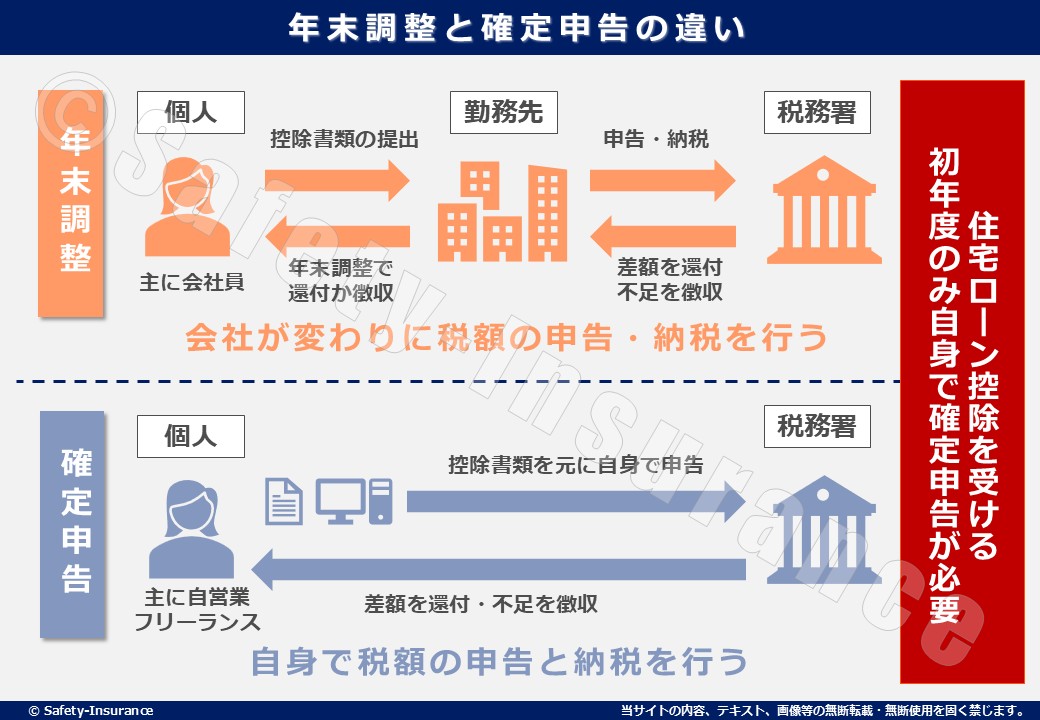 年末調整と確定申告の違いを簡単に説明すると、年末調整は会社が代行して税金を精算する仕組みであり、確定申告は個人で税金を申告・精算する手続きです。