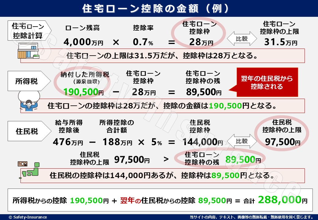 Aさんの例では、所得税からの控除 190,500円 + 翌年の住民税からの控除 89,500円 = 合計 280,000円が控除される計算となります。