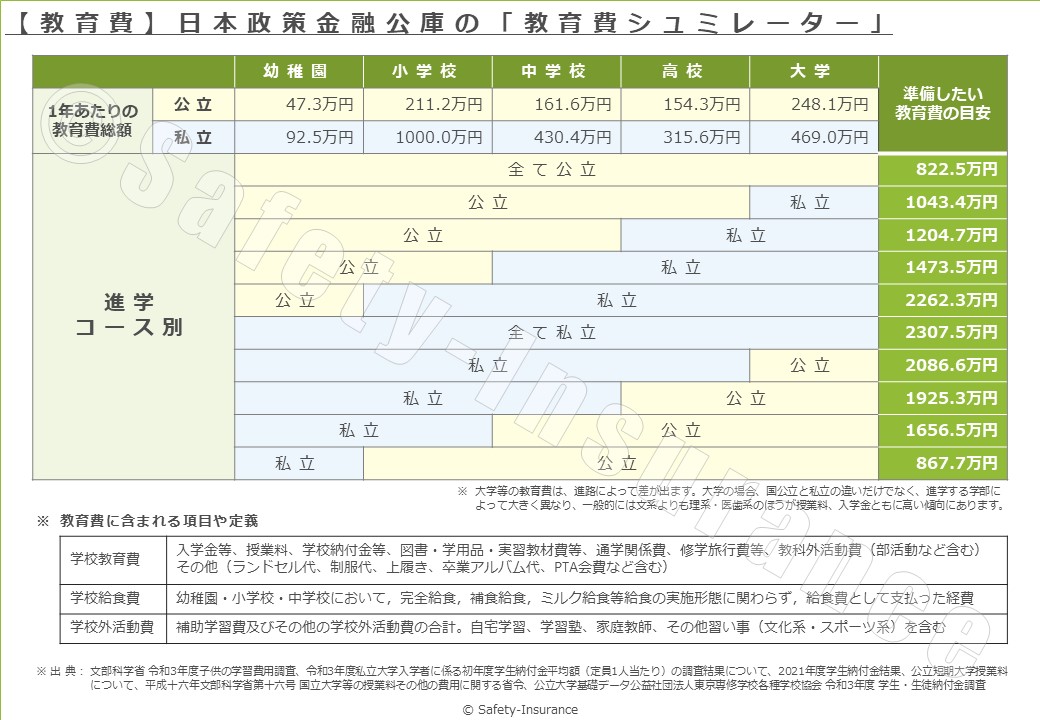 そのシュミレーションを行うと、幼稚園から大学まで全て公立の場合は約838.5万円、全て私立の場合は2261.4万円となっております。