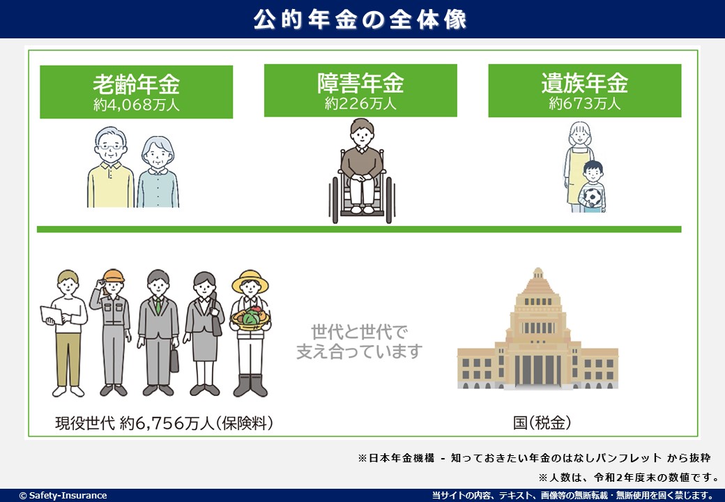公的年金制度とは、日本に住む現役世代(20~60歳未満)の全員で、「老後」「事故などで障害を負ったとき」「家族が亡くなったとき」の、くらしを支え合う。という考え方で作られた公的な仕組みです。