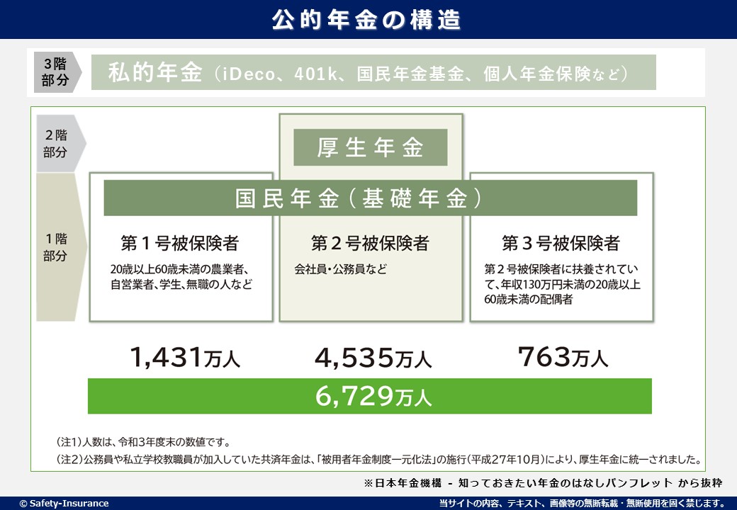 年金は現役世代(20~60歳未満)の全員が加入する「国民年金」と、会社員や公務員が加入する「厚生年金」の2階建て構造となっております。(会社員や公務員は国民年金と厚生年金の2つ加入している)