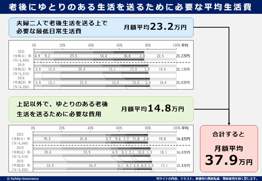 2つを合計すると、老後後にゆとりのある生活を送るために必要な平均生活費は、1ヵ月あたりの約37.9万円にもなるそうです。