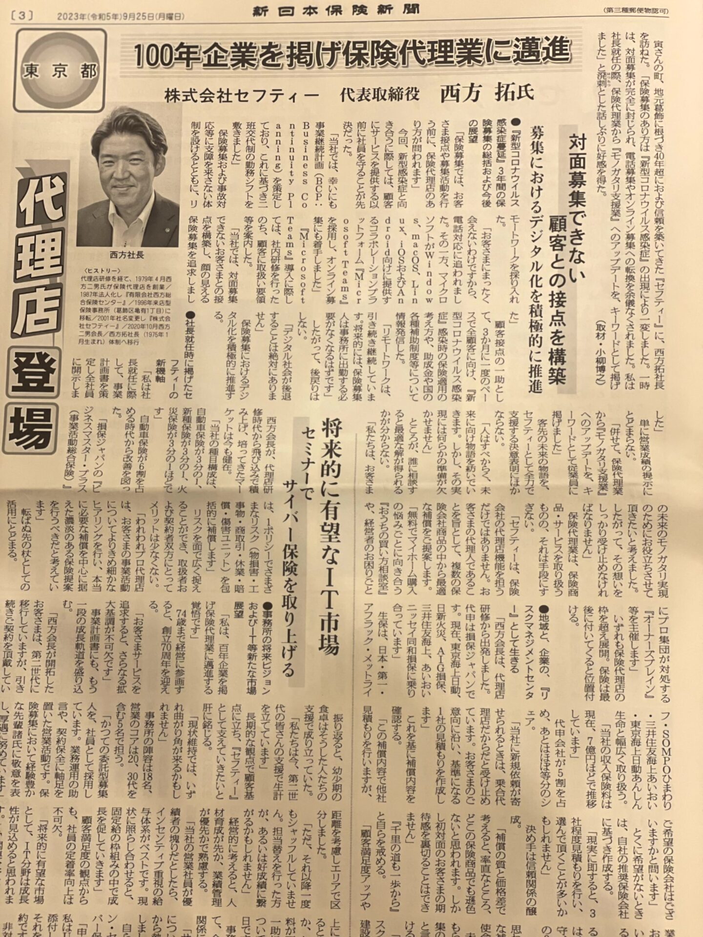 新日本保険新聞から弊社代表の西方 拓が取材を受け、執筆された記事が2023年9月25日に掲載されました。