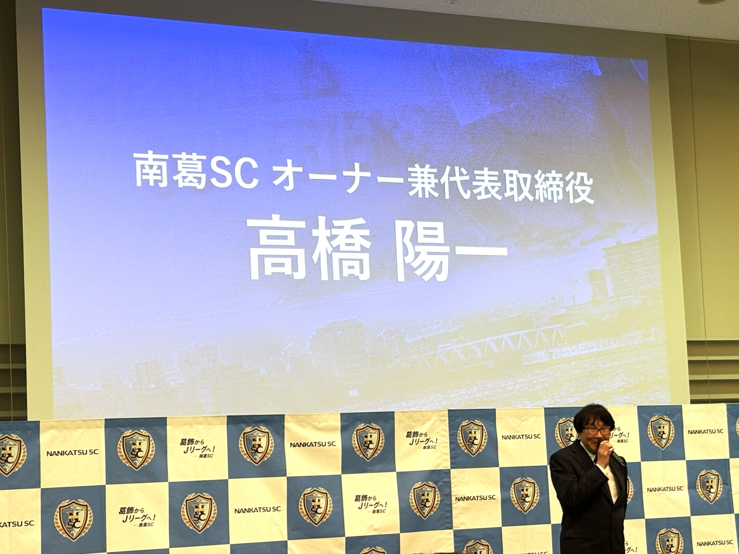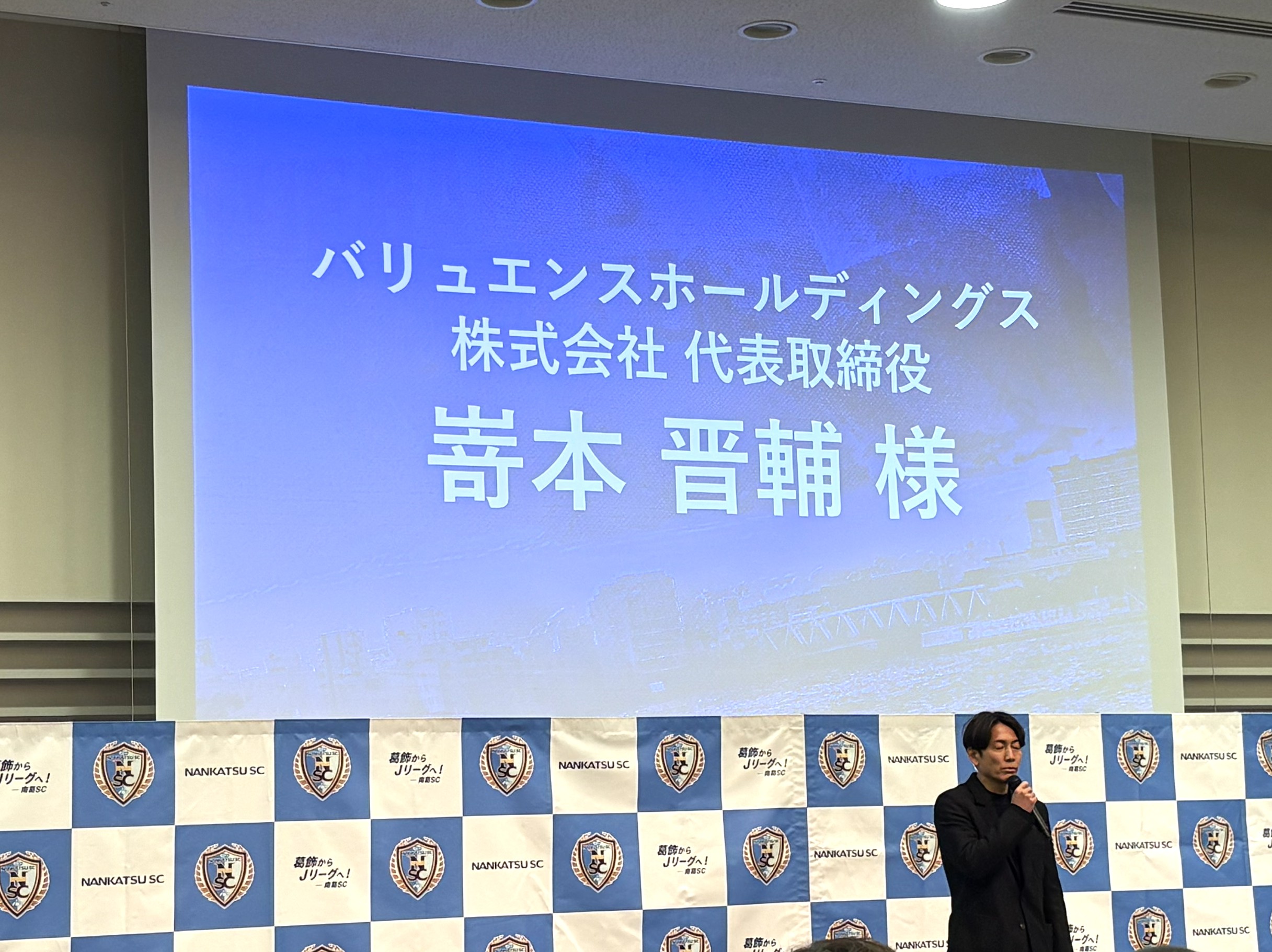 その後、メインパートナーであるバリュエンスホールディングス株式会社の嵜本晋輔社長が登壇。元プロサッカー選手というご経歴を持つ嵜本社長ならではの視点で、ビジネスとスポーツの両面から南葛SCの可能性について語られていたのが印象的でした。