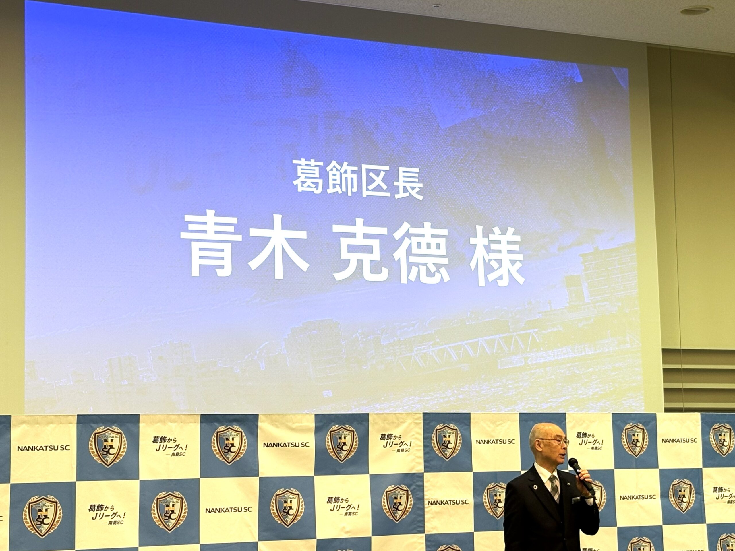 続いて、葛飾区の青木克徳区長からのご挨拶へ。区長は、南葛SCがどれだけ地域にポジティブな影響を与えているかを強調し、行政とクラブ、そして地域企業が連携している点こそが、南葛SCの大きな特長であると改めて実感。