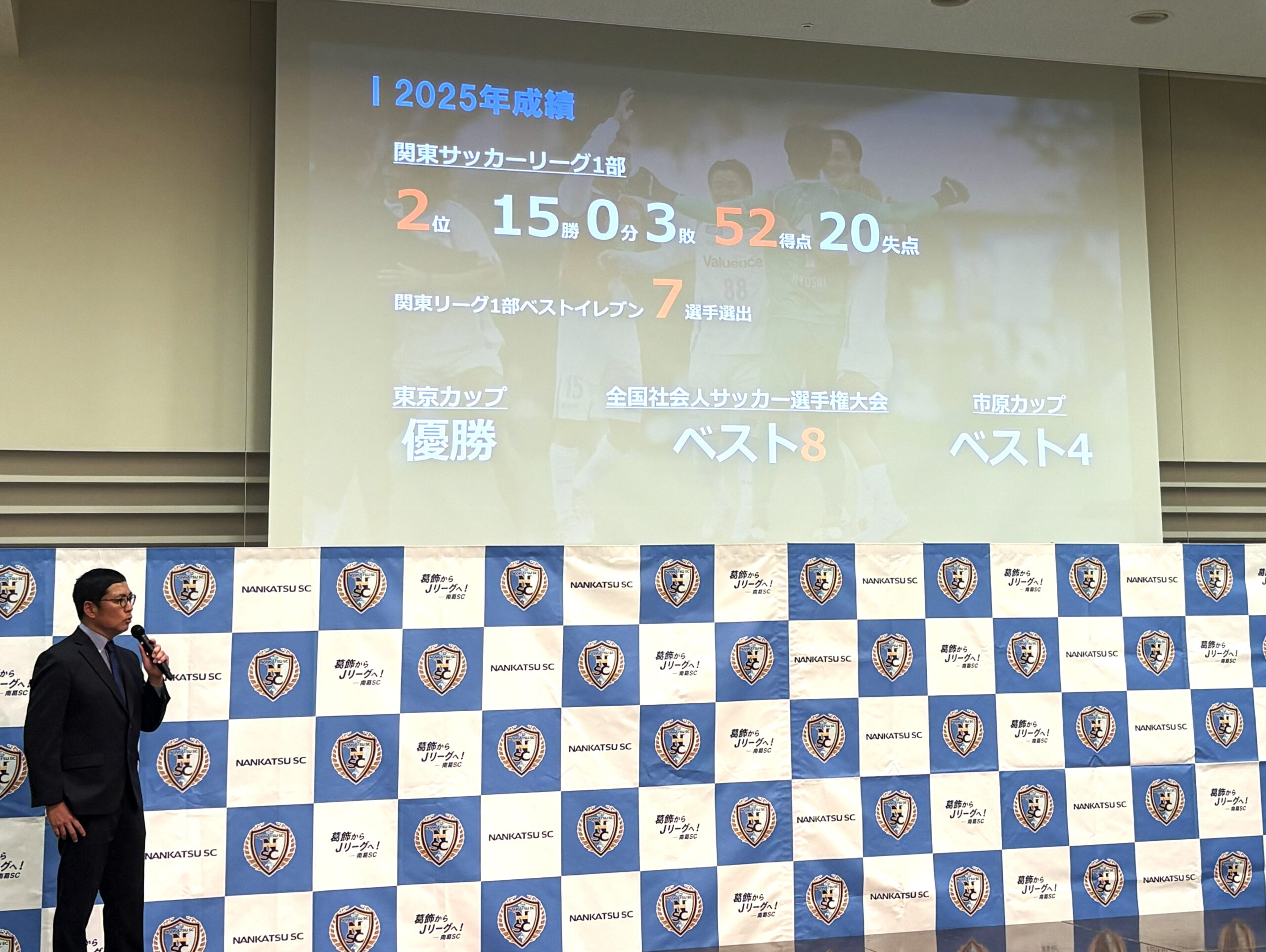2025シーズンの結果についても報告があり、南葛SCはリーグ2位という成績で、惜しくもJFL昇格にはあと一歩届きませんでした。