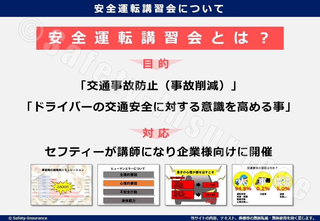セフティーでは『保険契約を弊社でお預かりしている企業様』に向けて安全運転講習会をサービスの一貫として無料でご提供しております。弊社お客様で開催をご希望の方は是非ご相談ください。