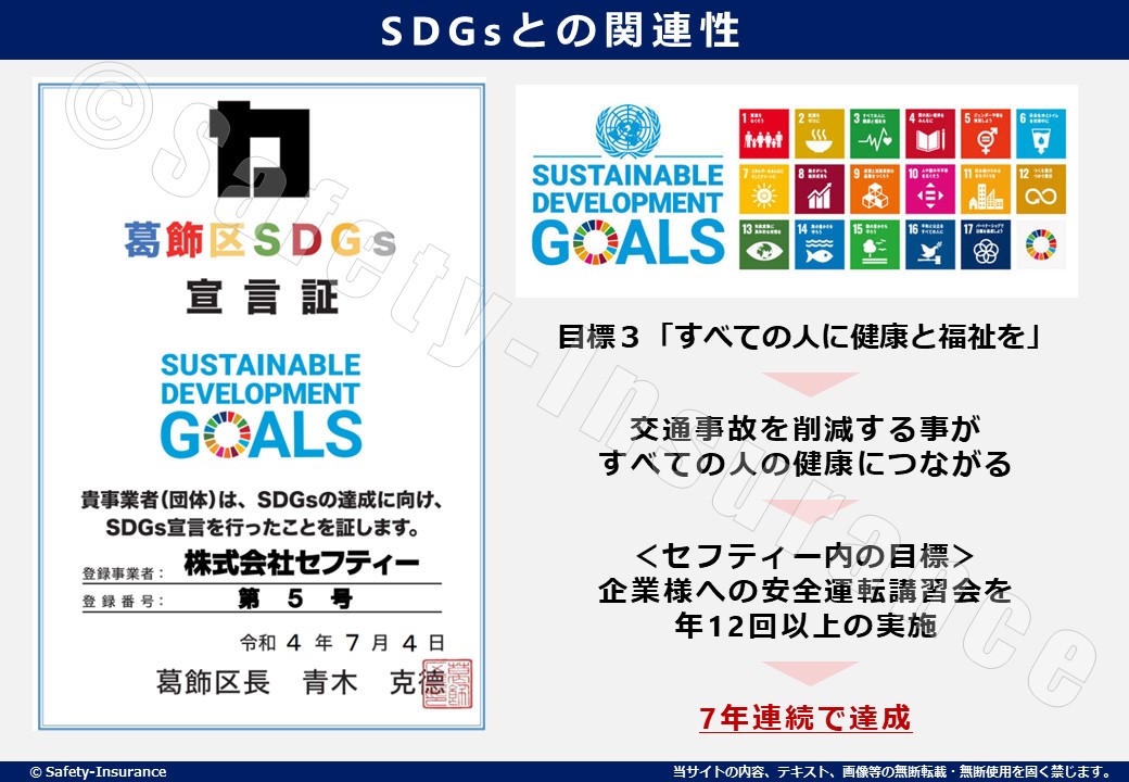 その中の、SDGs目標3「すべての人に健康と福祉を」において、弊社では「企業様への安全運転講習会の年12回以上の実施」を目標に掲げています。