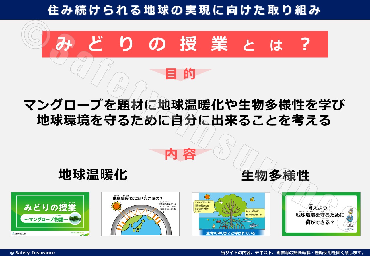 東京海上日動ではその「マングローブ植林活動」を題材に、地球温暖化防止や生物多様性について楽しみながら学ぶ、小学生や特別支援学校の児童生徒様向けの環境啓発授業「みどりの授業」を、2005年度から東京海上グループ社員と、地域の代理店がボランティアで講師を担当し全国で開催しています。