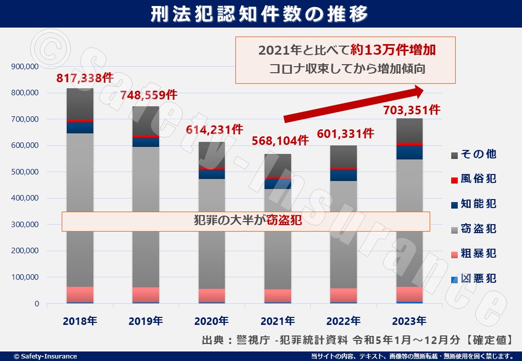 2023年の刑法犯認知件数は前年比で17%も増加して約70万件となり、2年連続で増加している傾向です。これは、2020年頃から新型コロナにより人流が少なくなったのと同時に、刑法犯認知件数も低下していたのが、コロナ収束に伴い人の流れが戻り犯罪も増加しているのが原因です。