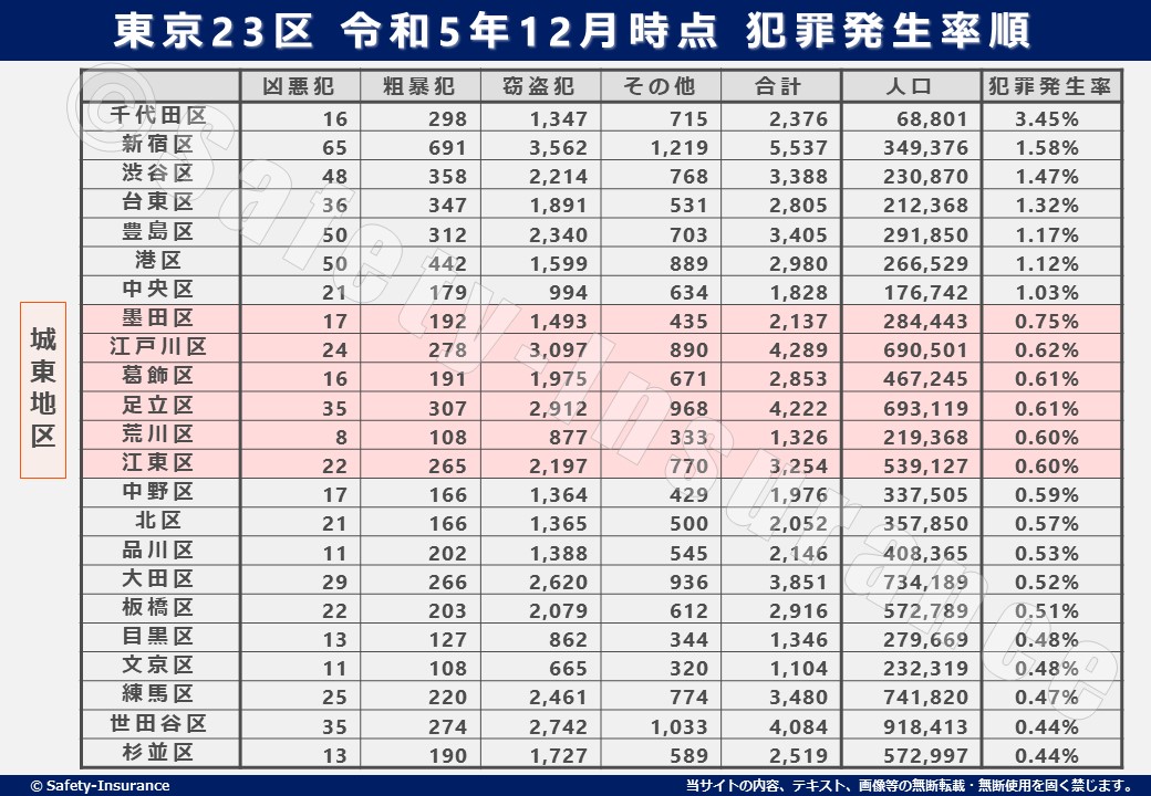 その一方で大きなターミナル駅がない、城東地区(葛飾区、足立区、荒川区、台東区、墨田区、江東区、江戸川区)も犯罪発生率が高いのも見逃せません。