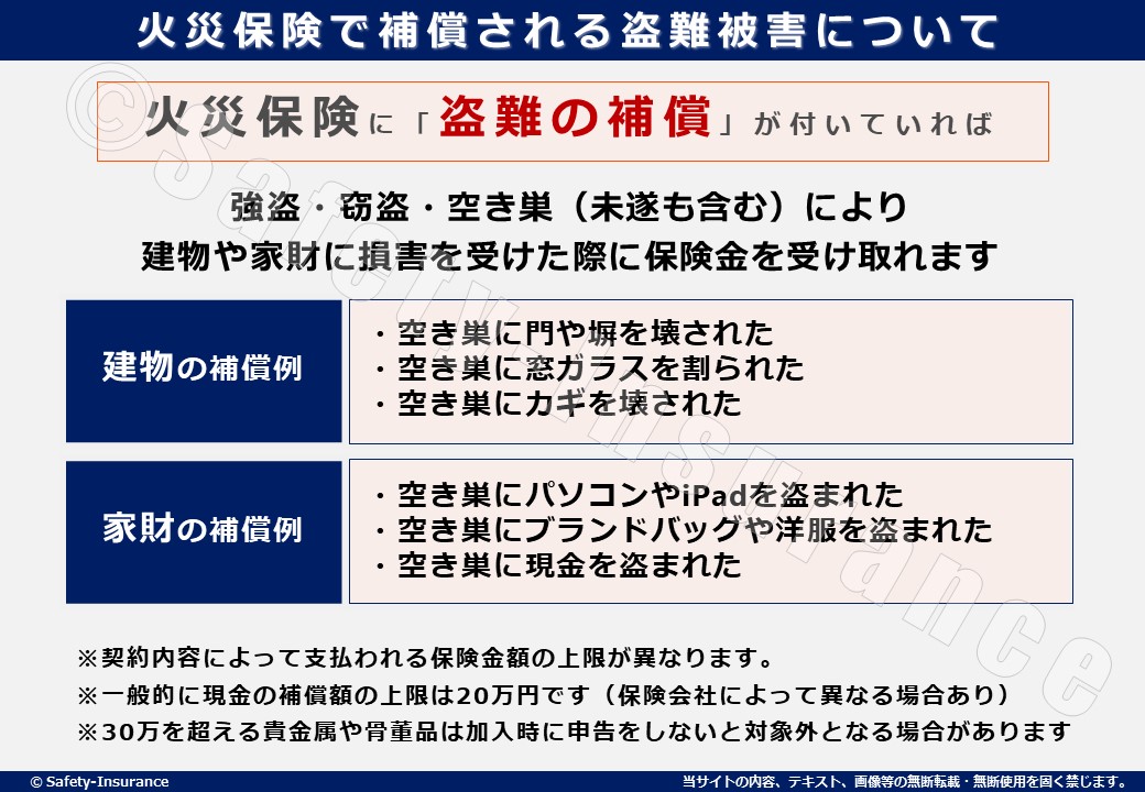 火災保険は名前から火災時のみ補償されると誤解される方もいますが、火災保険のプラン(補償内容)によっては、空き巣による「建物の損害」や「家財の盗難」についても補償を受けられる場合があります。