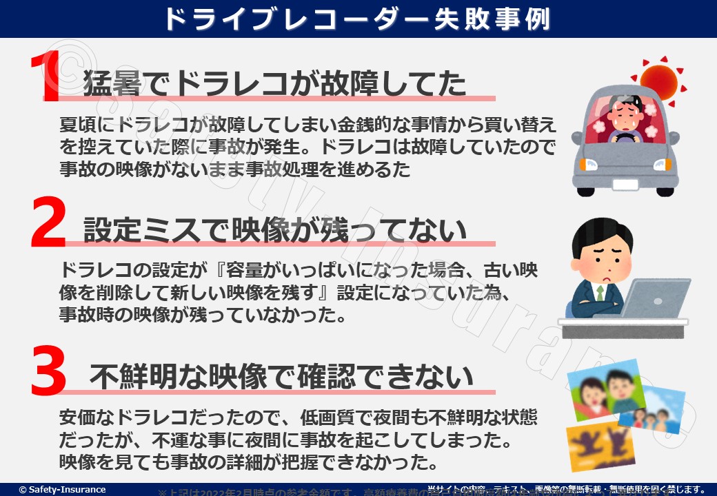 しかし、弊社では以下の様な失敗事例から『保険会社が自動車保険に特約として付帯できるドライブレコーダー』を推奨させて頂いております。